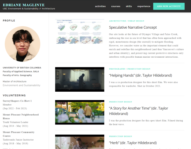 Some Great Examplesof ubcarts Digital Portfolios(always evolving!) If you think your portfolio would be a great example for other students, just drop us a line using the Email Support button at bottom right. Thanks! 1st year Media StudiesOpen Justin's Portfolio2nd year Media StudiesOpen Emily's Portfolio4th year GeographyOpen Christa's Portfolio2nd year Media StudiesOpen Sasha's Portfolio3rd year PSYC & ECONOpen Demo's PortfolioPost-doc Researcher & EditorOpen Letitia's PortfolioMasters in LAISOpen Billy's PortfolioMasters in LAISOpen Zachary's PortfolioRecent GEOG GradOpen Edriane's Portfolio